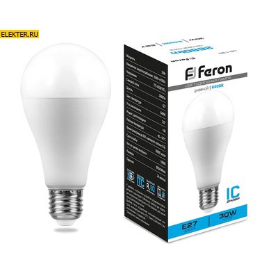 Лампа светодиодная FERON LB-130, A80 (шар), 30W 175-265V E27 6400К (дневной), рассеиватель матовый белый, 2680Lm, угол рассеивания 220°, 148*80мм