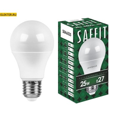 Лампа светодиодная SAFFIT SBA6525, A65 (шар), 25W 230V E27 6400К (дневной), рассеиватель матовый белый, 2150Lm, угол рассеивания 220°, 135*65мм