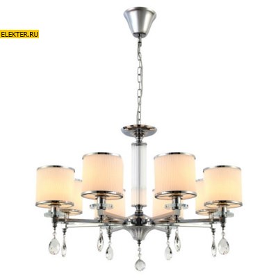 Универсальность эти люстры приобрели за счёт сочетания лаконичной арматуры актуального оттенка хром и классических стеклянных плафонов белого цвета. "Изюминкой" данных красивых люстр на потолок являются хрустальные капли-подвески на основании и каждом из 8 рожков.